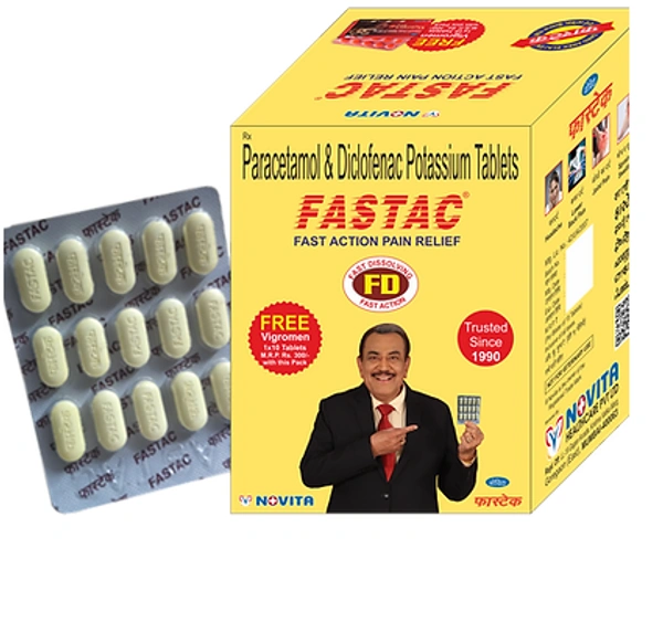 Fastac 50mg/325mg Tablet is a combination of two medicines: Diclofenac and Paracetamol. These medicines work by blocking the action of chemical messengers responsible for pain, fever and inflammation (redness and swelling).