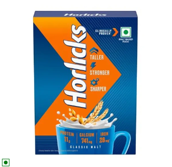 Horlicks is India's #1 Nutrition Drink that helps kids be Taller, Stronger, Sharper. It contains 27 vital nutrients like Folic Acid, Vitamin D, Protein, Calcium, and Iron that help in mental development and physical strength. It also has Zinc and Vitamin E that build immunity. Horlicks is also available in Chocolate Delight flavour. For over 150 years, Horlicks has stayed true to its original purpose of providing high-quality, wholesome nutrition. Made with the goodness of milk, wheat, and barley, and fortified with 27 vital nutrients. Regular intake of Horlicks with a daily diet helps in children's growth and development like better bones, more muscles and improved concentration scores. Horlicks is clinically proven to make kids Taller, Stronger, Sharper! For your favourite cup of Horlicks, just take 200 ml of hot or cold milk or water, add 3 spoons (27 g) of Horlicks, stir briskly, and enjoy! This iconic drink has been a household name for over a century, synonymous with nourishment and wellness. Today, Horlicks stands as a beacon of nutritional goodness, cherished by generations across the globe.