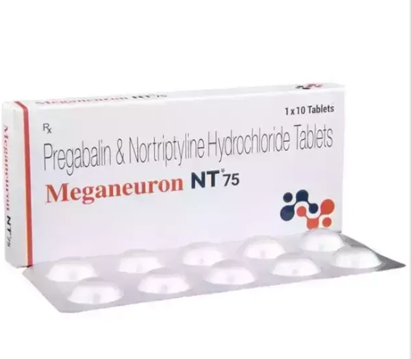 Meganeuron NT + 75 Tablet is a combination of three medicines: Pregabalin, Nortriptyline and Methylcobalamin. Pregabalin is an alpha 2 delta ligand which decreases pain by modulating calcium channel activity of the nerve cells. Nortriptyline is a tricyclic antidepressant which increases the levels of chemical messengers (serotonin and noradrenaline) that stop the movement of pain signals in the brain. Methylcobalamin is a form of vitamin B which helps in the production of myelin, a substance that protects nerve fibers and rejuvenates damaged nerve cells. Together, they relieve neuropathic pain (pain from damaged nerves).